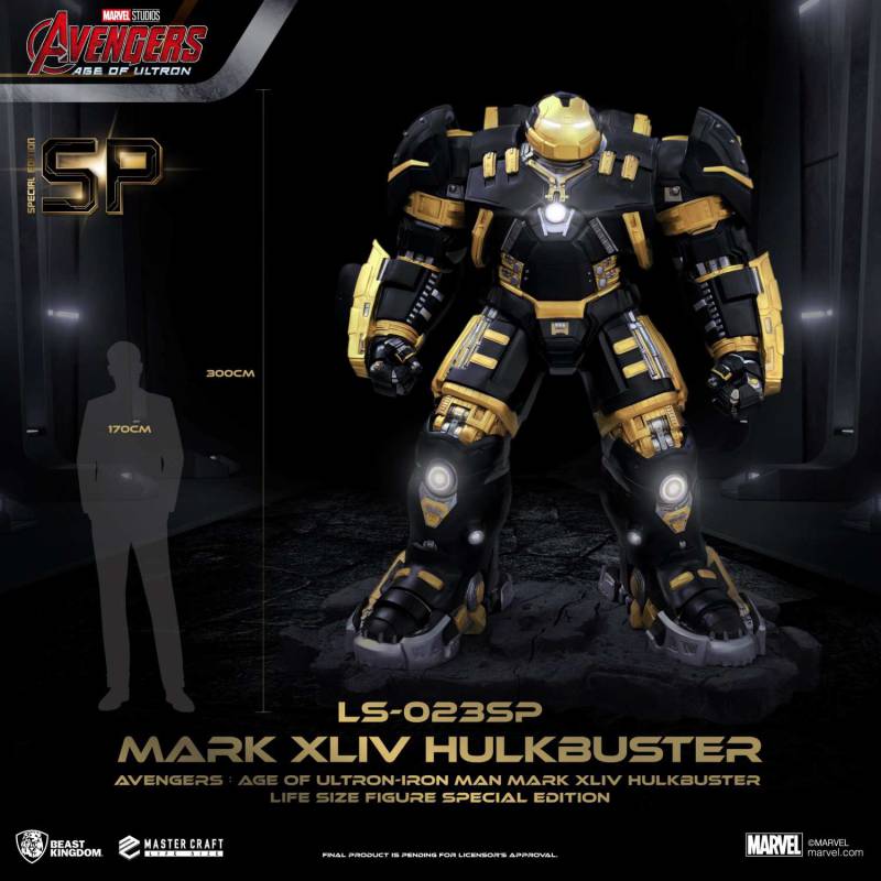 Beast Kingdom Toys is proud to present the LS-023SP Avengers:Age of Ultron-Iron Man Mark XLIV Hulkbuster Life Size Figure Special Edition. The statue features fiberglass construction and automotive paint to perfectly represent the Iron Man armor. Every intricate parts seen in the movie is captured with expert sculpting and individually hand-painted, showing off the highly detailed mechanical construction. The statue has LED lights installed in the Iron Man's eyes, arc reactor, palms, vernier thruster, and knee (18 LED light-up points) that makes Hulkbuster look even more majestic. Every Hulkbuster life-sized statue features a paired with realistic movie scenery lookend base, that shows the unstoppable strength. The paint-job has been upgraded to a limited gold and black coloring, a variant built for fans of exclusive releases.