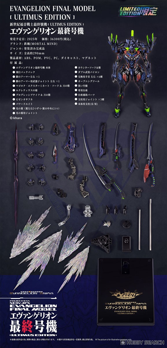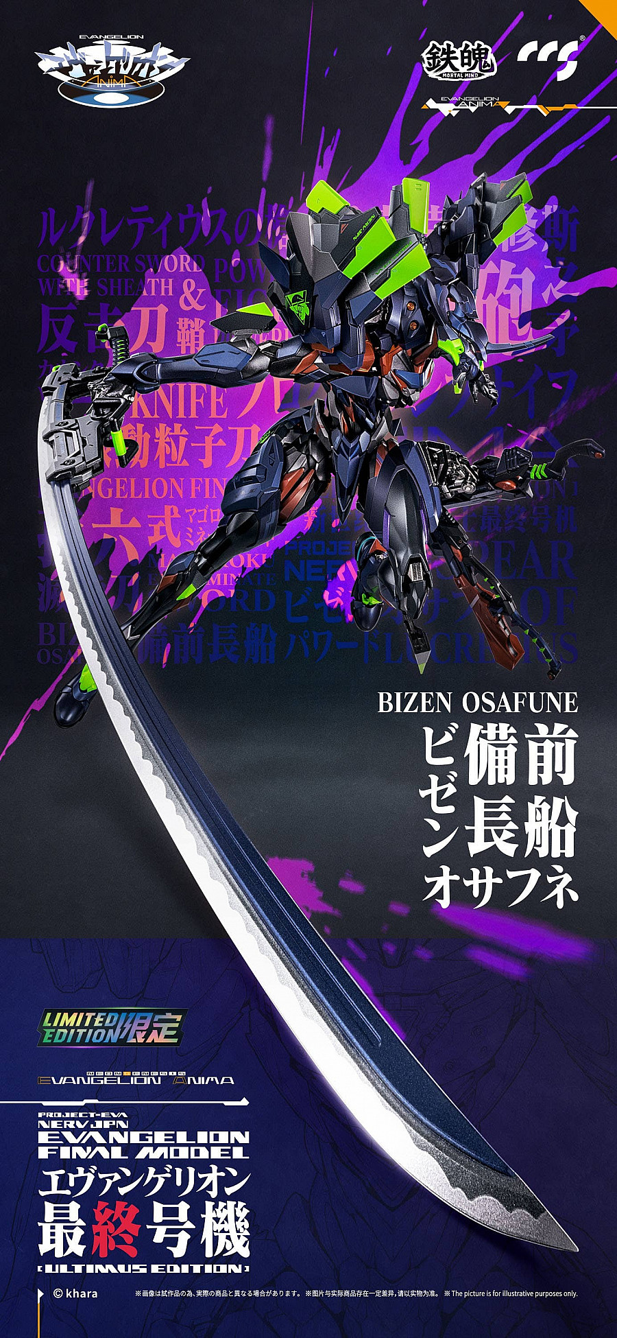 - Set contents: Evangelion Final Unit, flight backpack, leg armor x 1 pair, leg armor weapon joint x 1 pair, Bizen Osafune, Magoroku Exterminate Sword & sheath, Progressive Knife & sheath, Counter Sword & sheath (new equipment), Spear of Lucretius, Powered Eight, Wing of Light effect parts, joint for Wing of Light effect parts, black disc, replacement wrists (left and right) x 6 pairs, opening tool, dedicated pedestal, support joint x 3 types, pedestal support (long, short)