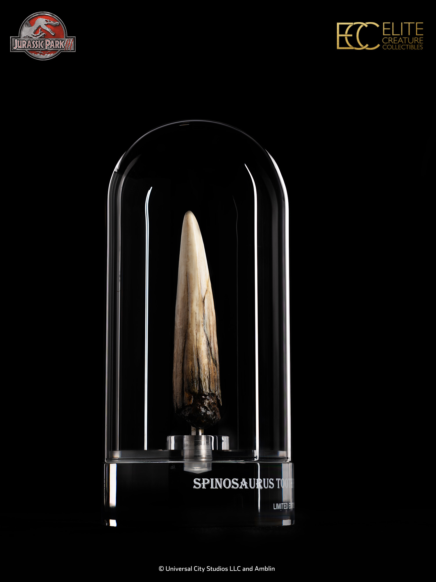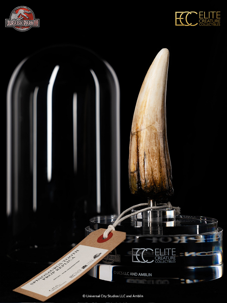 Elite Creature Collectibles is proud to present this Spinosaurus Tooth Prop Reproduction for Jurassic Park fans and collectors. The prototype tooth was further refined by legendary special effects artist Rob Hinderstein, who added additional cracking and scratch details to enhance screen accuracy.