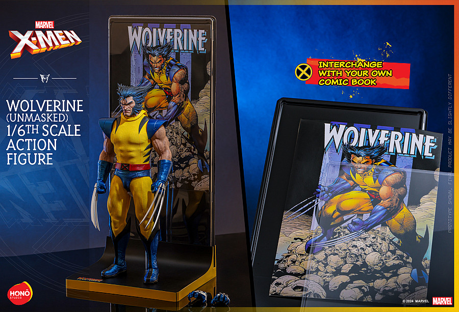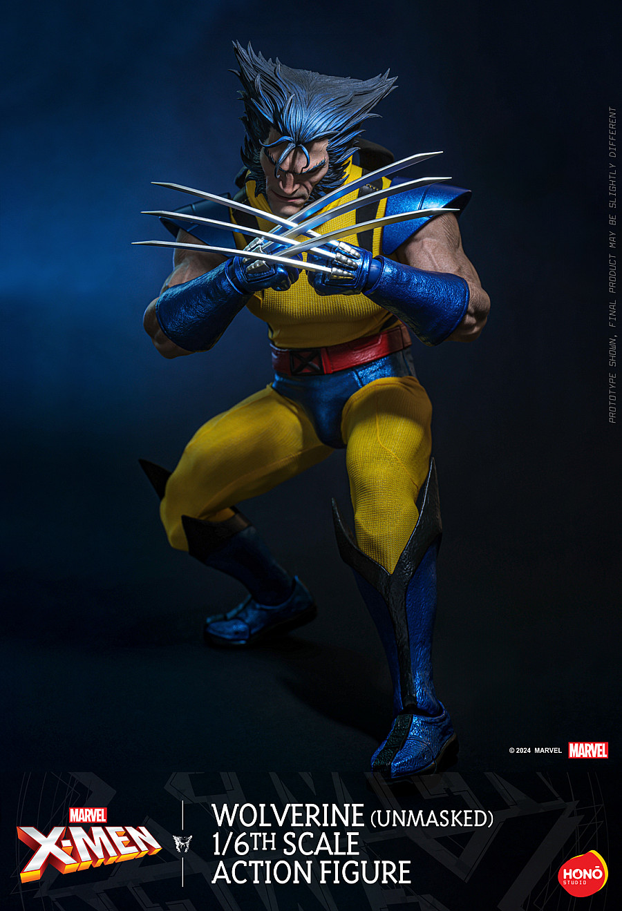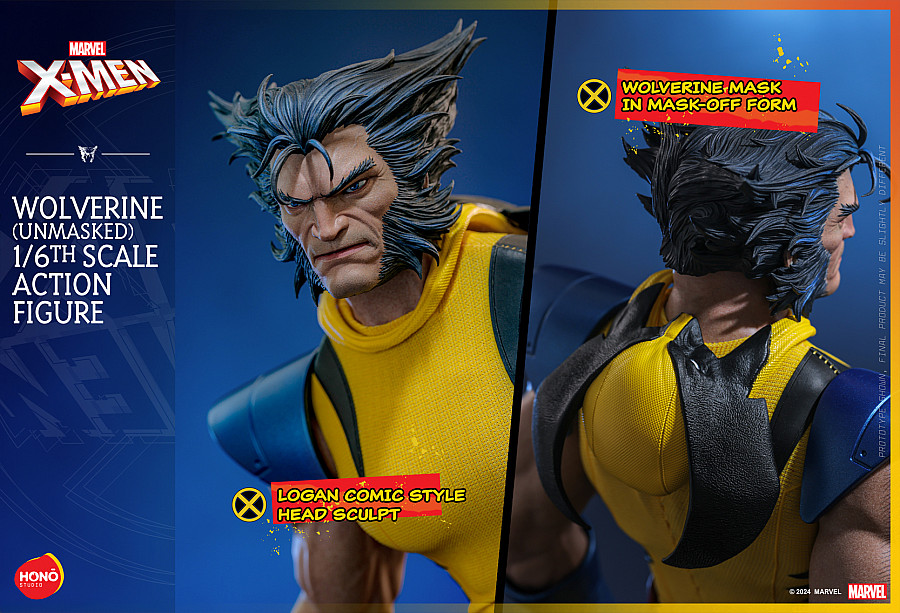 One of the most legendary comic classics, X-Men, transformed into action figures by HONŌ STUDIO! This unmasked version of the Wolverine action figure features a detailed head sculpt that brings Logan's rugged appearance and determined expression to life. Crafted in a vibrant yellow and metallic blue costume with animalistic stripes and a Wolverine mask in its mask-off state, this figure replicates the look of the character when he unveils his mask. This 1/6th scale figure boasts multiple points of articulation and seamless silicone arms, flawlessly capturing Wolverine's muscular build. The action figure comes with a comic cover-style backdrop and includes interchangeable hands and claws, enabling a variety of dynamic poses. It perfectly captures the essence of this iconic comic character and is a must-have for any Marvel comic fans.