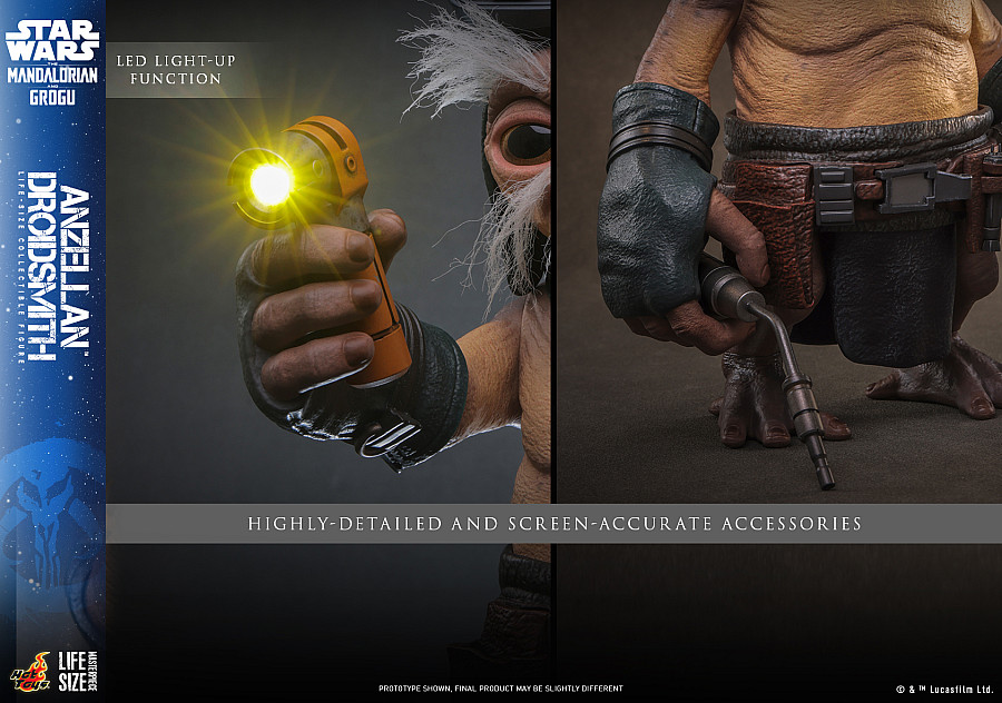 Today, Hot Toys is delighted to expand the Star Wars: The Mandalorian & Grogu™ collection by introducing the Anzellan Droidsmith™ Life-Size Collectible Figure! Standing approximately 27cm tall, this life-size figure captures the adorable yet rugged appearance of the Droidsmith. The collectible features a newly developed head sculpt with an authentic likeness, movie-accurate facial expression, detailed wrinkles, and skin texture. To achieve a realistic look, the figure features gray eyebrows and a beard made from fiber material. The specialized body is constructed from soft vinyl material with 8 points of articulation, allowing collectors to recreate the Droidsmith’s charming gestures.