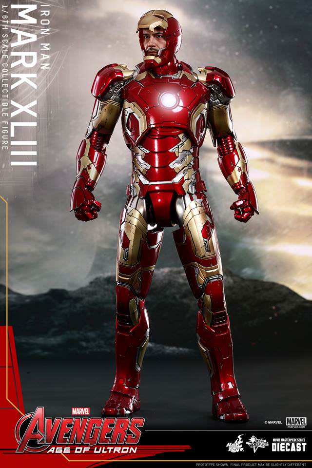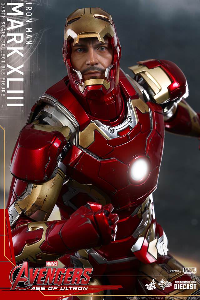 The movie-accurate Mark XLIII Collectible Figure is highly detailed and specially crafted based on the image of Robert Downey Jr as Tony Stark/Mark XLIII in Avengers: Age of Ultron, featuring a newly painted Tony Stark helmeted head sculpt, metallic red, gold and silver armor with weathered effects, LED light-up functions, and a specially designed diorama base with a damaged Ultron Mark I. A special edition will be available for selected markets which includes a LED lighted battle damaged helmet as bonus accessory.
