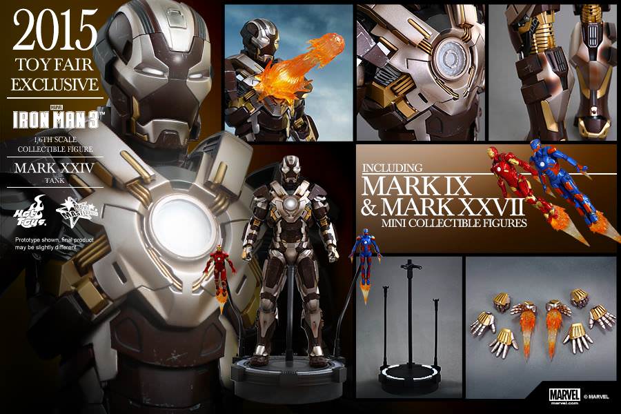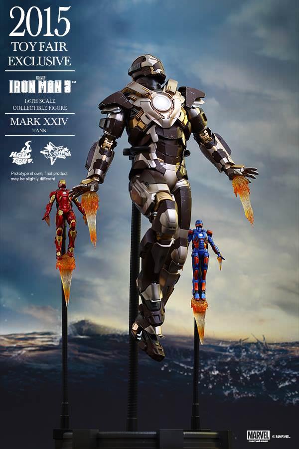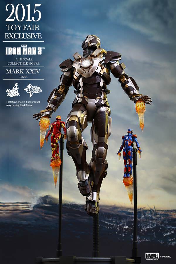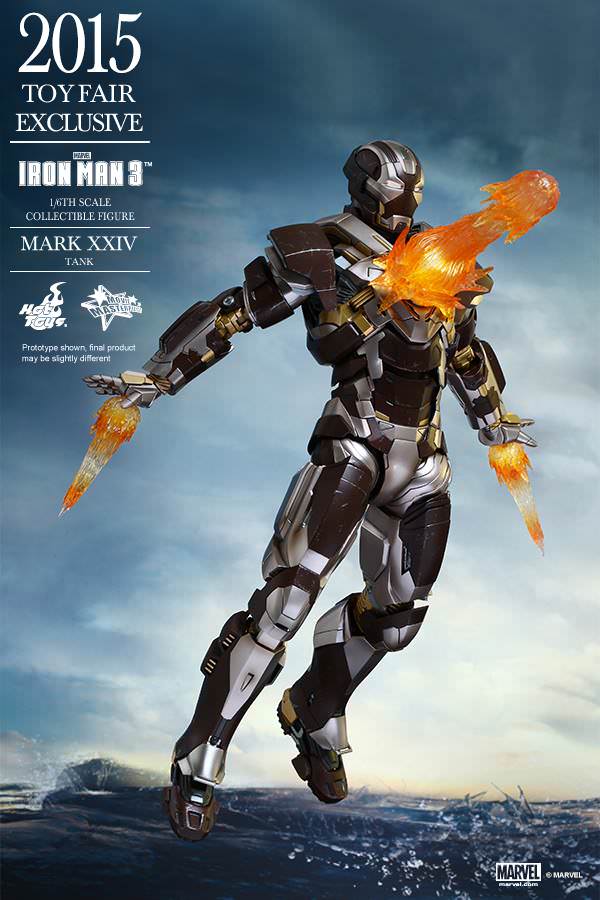 Today Hot Toys is excited to present the new 1/6th scale Tank (Mark XXIV) Collectible Figure, the Heavy Combat Suit, as one of the 2015 Toy Fair Exclusive items. It features metallic brown and gold-colored armor, Unibeam and thruster effects accessories, LED light-up functions, a dynamic figure stand, and Mark IX and Disco (Mark XXVII) mini collectible figures that are perfect for recreating the iconic Iron Man 3 poster where the House Party Protocol Suits are flying into action.