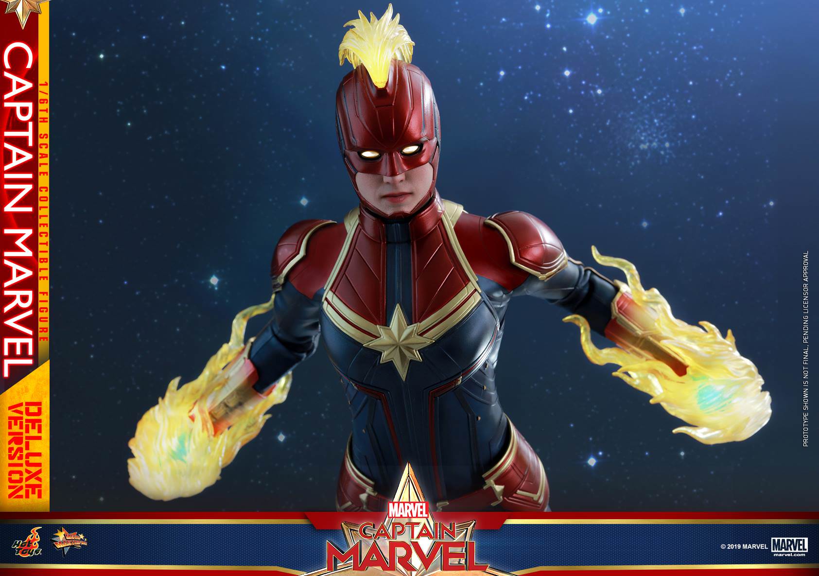 - One (1) newly developed interchangeable Captain Marvel helmeted head sculpt with LED light-up function (white light, battery operated)
