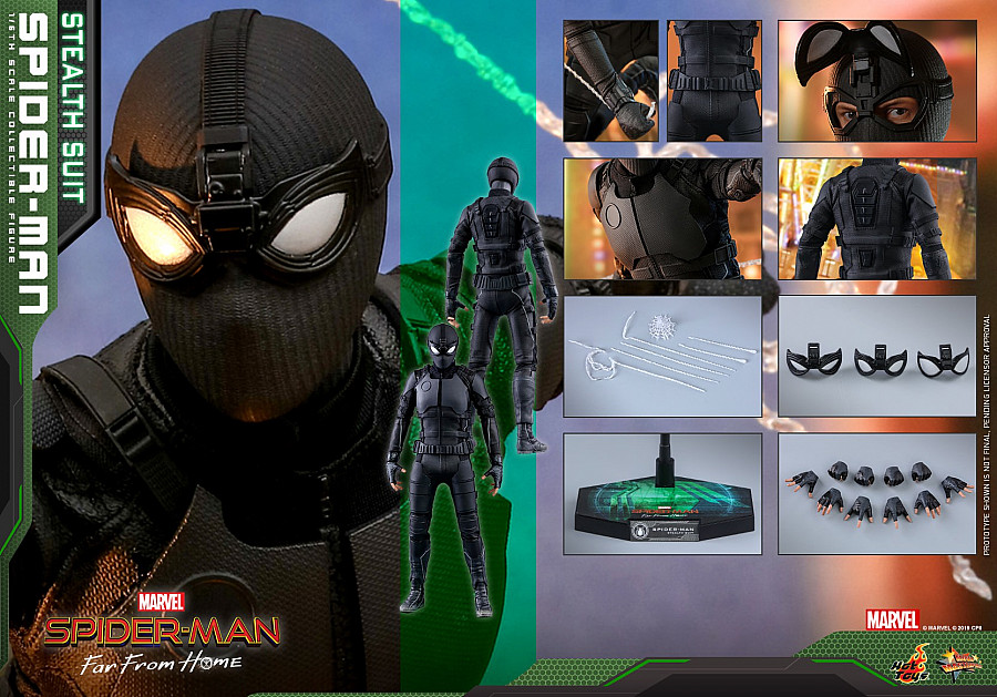 pider-Man is coming back on the big screen for another exciting adventure! This time our friendly neighborhood super hero has decided to join his friends and the rest of the gang on a vacation to Europe, and leave the heroics at home to focus on his friendships. Inspired by the upcoming Spider-Man: Far From Home, Hot Toys is thrilled to officially present our latest movie masterpiece – 1/6th scale Spider-Man (Stealth Suit) Collectible Figure captures Spider-Man in his new black suit!