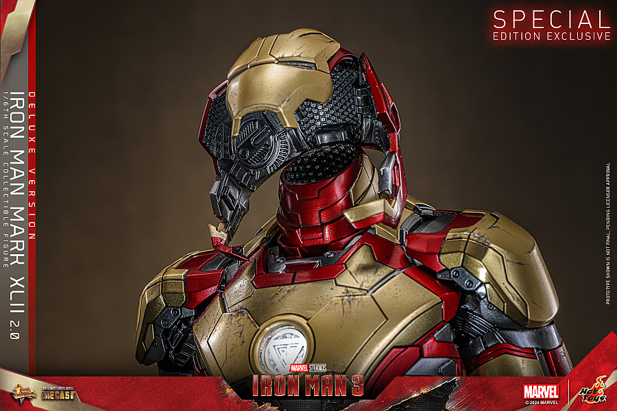 The Mark XLII, also known as the "Autonomous Prehensile Propulsion Suit", was the main armor used by Tony Stark in the movie Iron Man 3. It is regarded as one of the most advanced suits that Stark has created. Bringing this armor to life, Hot Toys is thrilled to present the Deluxe Version of 1/6th scale Iron Man Mark XLII (2.0) collectible figure which allows different modes of display.