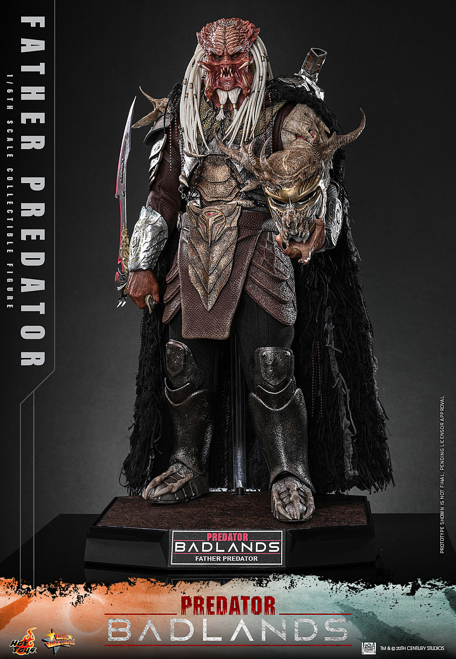 Hot Toys proudly presents the 1/6th scale Father Predator Collectible Figure. Standing approximately 37cm tall, the figure features a newly developed head sculpt with separate rolling eyeballs. His distinctive white dreadlocks are adorned with gold-colored rings and are complemented by sculpted white spines and beard elements. Two sets of interchangeable mandibles are included, allowing collectors to display Father in varying states of aggression. Father’s newly developed body features a torso constructed from soft vinyl material, achieving a seamless design. Seven pieces of newly developed interchangeable hands, including a range of gesture hands, a wounded hand, and weapon-holding options, enable expressive poses that convey both ferocity and toughness.