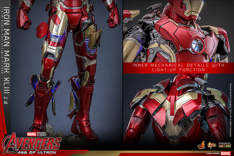 Today, Hot Toys is thrilled to officially introduce the highly anticipated 1/6th scale Iron Man Mark XLIII (2.0) Collectible Figure. This figure has been revitalized with incredible attention to detail, featuring a move-accurate Tony Stark head sculpt equipped with separate rolling eyeballs and battle-damaged paint applications to bring Robert Downey Jr.’s character to life like never before. An Iron Man helmeted head with LED light-up function and two interchangeable faceplates (normal and battle-damaged) is also included for alternate display options.