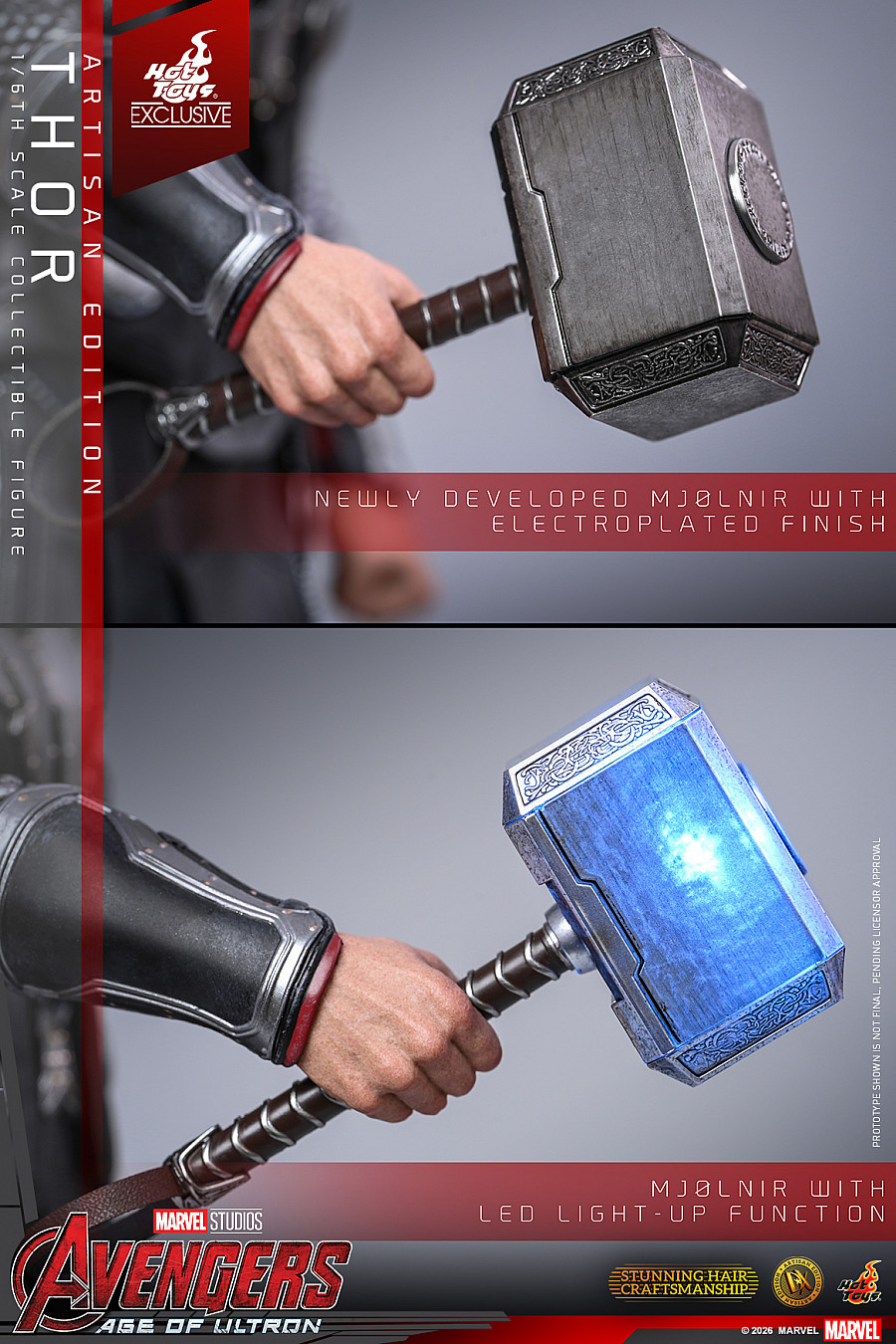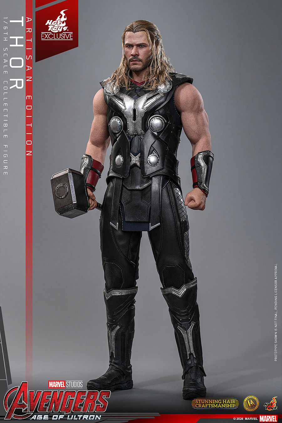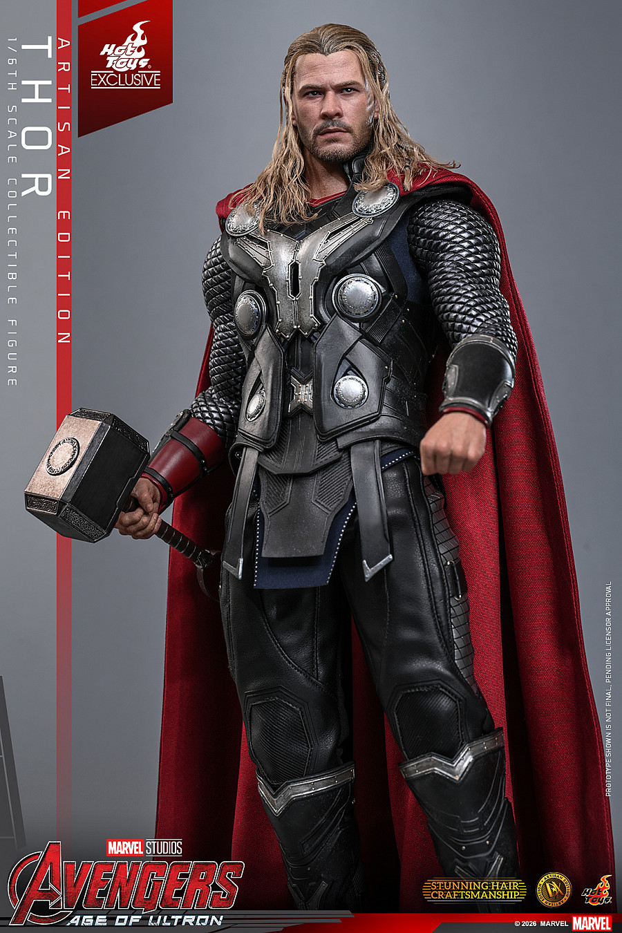 Hot Toys proudly presents the highly anticipated 1/6th scale Thor Collectible Figure (Artisan Edition). The newly developed head sculpt features separate rolling eyeballs, detailed beard, and lifelike skin textures to perfectly capture Chris Hemsworth’s portrayal. Elevating this Artisan Edition is Thor’s meticulously implanted long blonde hairstyle, expertly styled from wool material into flowing waves with braided sections and hair tie details. The figure features a muscular body with two sets of interchangeable arms. One pair made of silicone and another scale-armored pair made of soft vinyl — all constructed with inner metal skeletons for a seamless joint design. A selection of ten interchangeable hands supports a wide range of dynamic gestures, from summoning to wielding Mjølnir in battle.