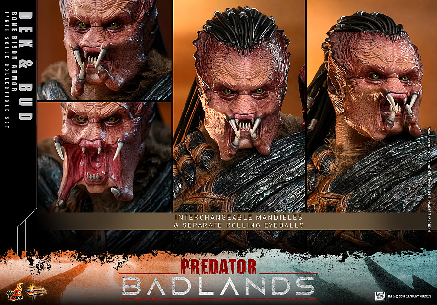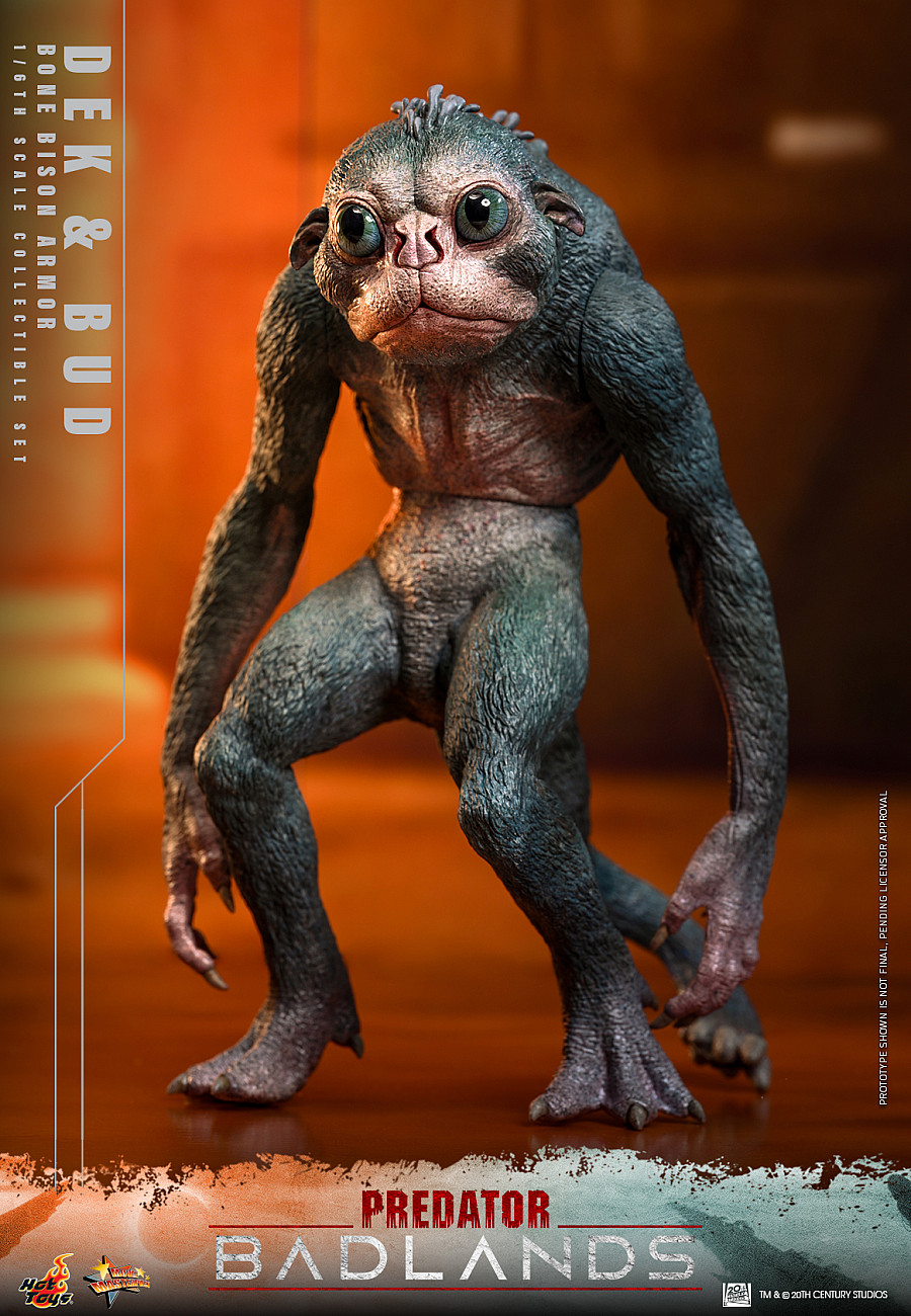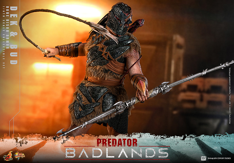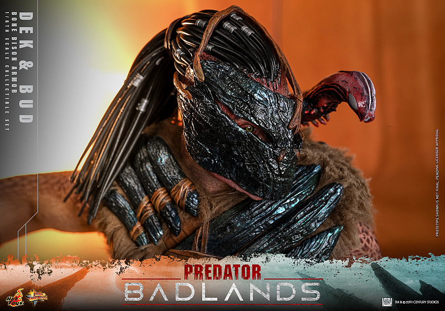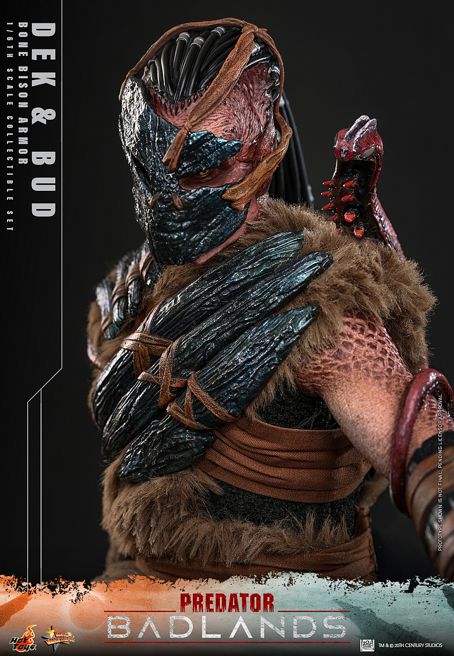 Today, Hot Toys is thrilled to expand our Predator: Badlands collection by introducing the 1/6th scale Dek (Bone Bison Armor) and Bud Collectible Set! The 1/6th scale Dek (Bone Bison Armor) Collectible Figure features a finely crafted head sculpt with separate rolling eyeballs, sculpted black slicked-back dreadlocks, and two sets of interchangeable mandibles to bring Dek’s fierce expressions to life. Dek’s physique is accurately represented by a specialized body utilizing soft vinyl material across the arms and legs for a seamless joint design. His striking Bone Bison Armor is expertly crafted over brown fur fabric cloth and a black tunic, accented by greaves and wrist gauntlets with a Luna Bug fang wrist blade on the left gauntlet, and an attachable Bone Bison mask to perfectly complement the primal aesthetic.