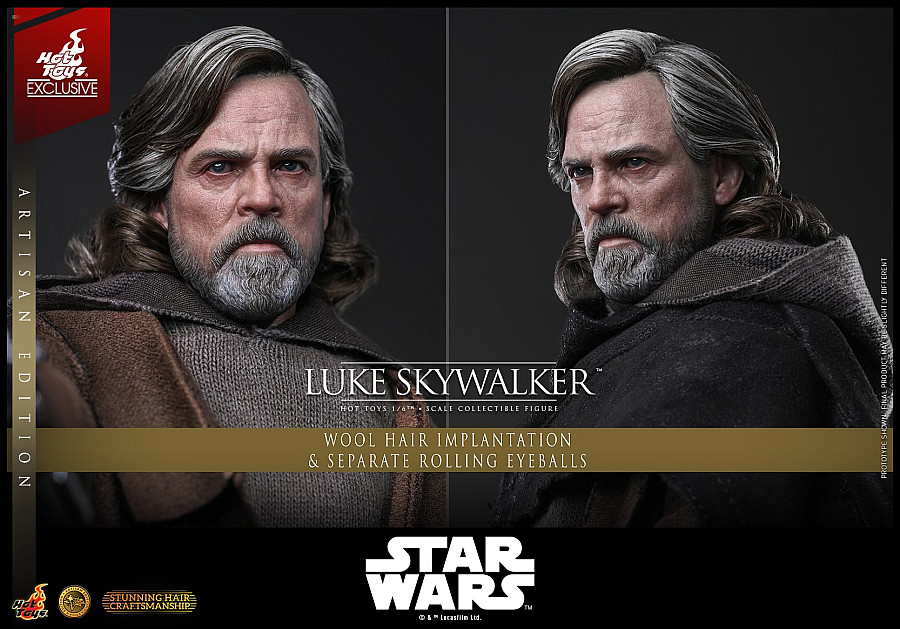 Today, Hot Toys is incredibly proud to introduce the 1/6th scale Luke Skywalker™ Collectible Figure (Artisan Edition), based on his appearance in Star Wars: The Last Jedi™. The figure features a newly developed head sculpt of Mark Hamill with separate rolling eyeballs, complete with incredibly detailed wrinkles, beard, and skin texture. A highlight of this figure is the meticulously implanted mid-length hairstyle — utilizing premium wool material to recreate his complex blend of gray, white, and faded sandy-blonde hair to achieve lifelike realism. Standing approximately 29 cm tall, Luke is dressed in a masterfully tailored multi-layered outfit designed to reflect his life on the island. The costume features a black poncho, a brown worn jacket, a gray hooded tunic, and a pair of black pants paired with a belt and dark gray boots.