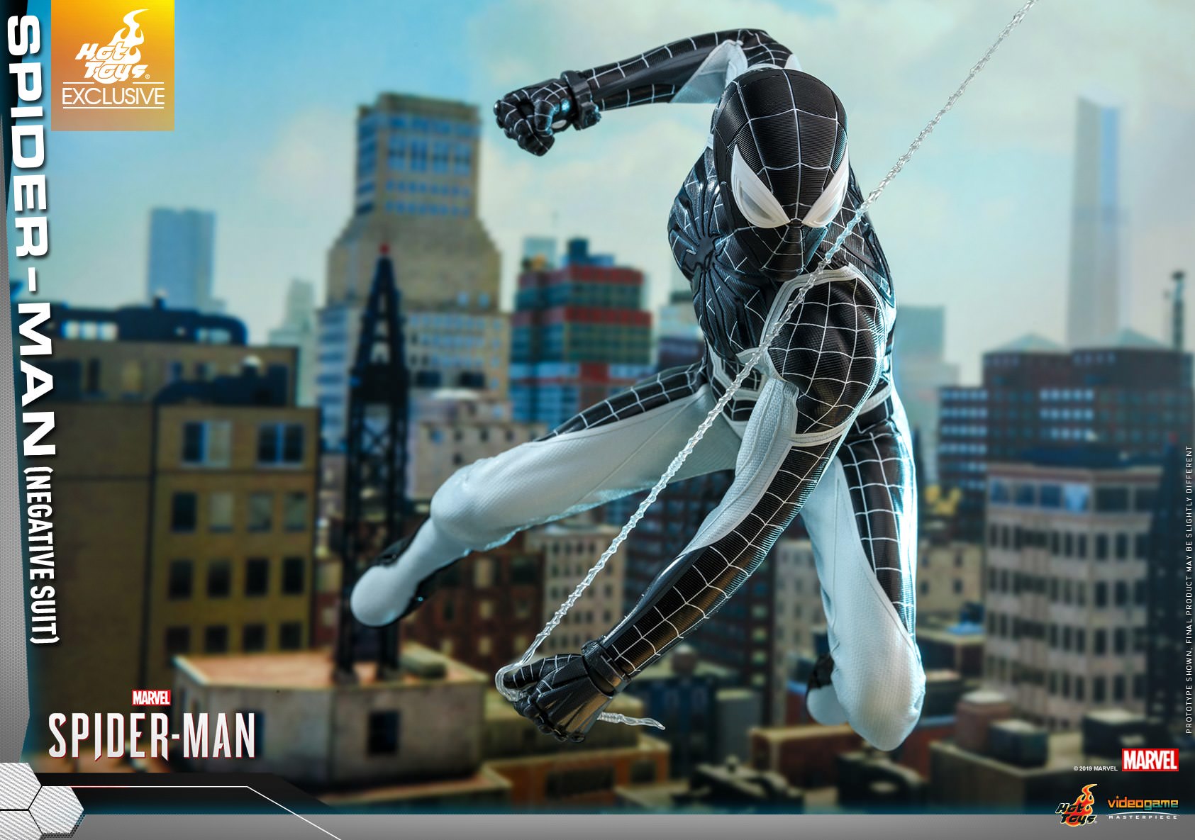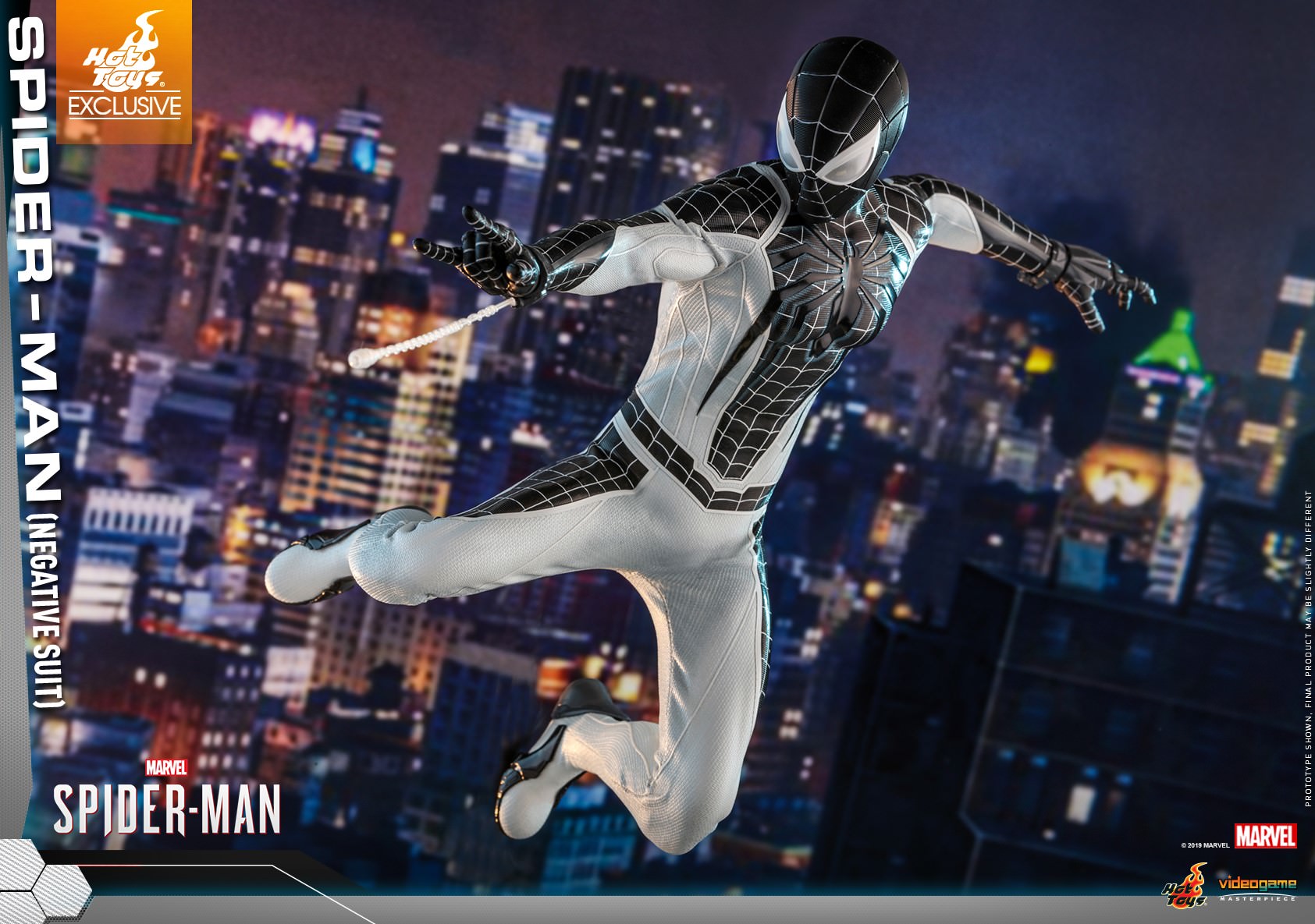 The figure is carefully crafted based on the Negative Suit in the Marvel’s Spider-Man video game, featuring a newly developed masked head sculpt with three pairs of interchangeable eye pieces; a specialized body with terrific range of movement; a monochromatic Spidey suit with a negative version of the games iconic white spider emblem, now black, on chest; matching interchangeable hands for different signature postures; Web-Shooters; a Spider-Drone; trip mines; web bombs; Vulture Jammer; a variety of web accessories; and a stylishly designed dynamic figure stand.