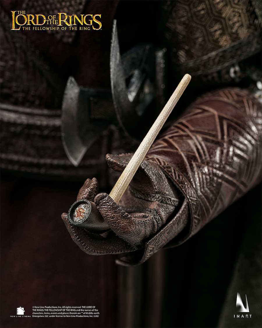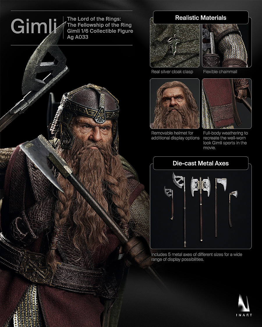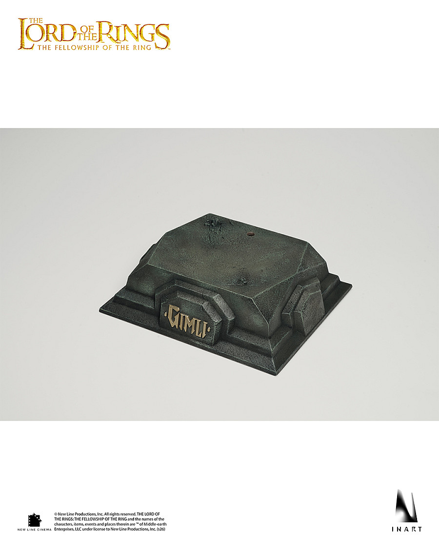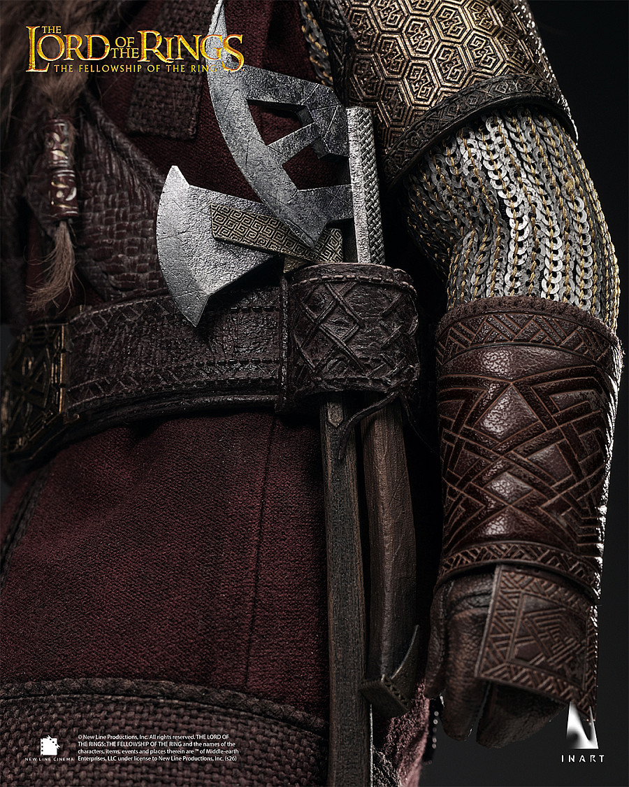 Real silver cloak clasp, flexible chainmail, and removable helmet for additional display options. Full-body weathering to recreate the well-worn look Gimli sports in the movie.