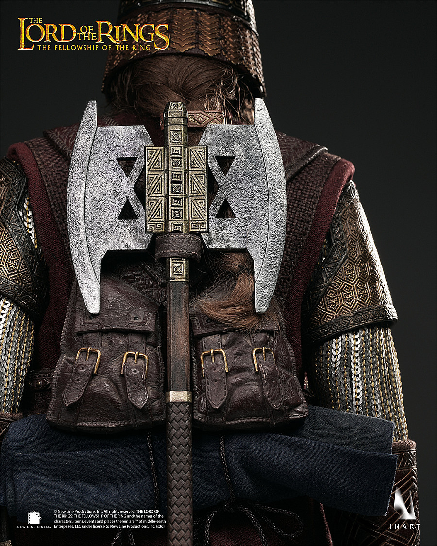 Head sculpt with articualted eyes as well as fully rooted hair and beard. Intricate braids and metal accessories bring out Gimli's rugged Dwarven look.
