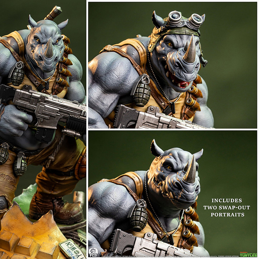 This highly detailed statue features beautiful sculpting throughout, from the leather like texture of Rocksteady’s skin to the mechanical details of his blaster and other armaments. This mutant menace is outfitted with a ton of beautifully realized accessories including grenades, a turtle shell knee pad, a massive knife strapped to his back and a bandolier packed with heavy artillery. The Rocksteady 1:3 Statue also includes a swap out portrait without his military-style cap and goggles offering collectors multiple display options.