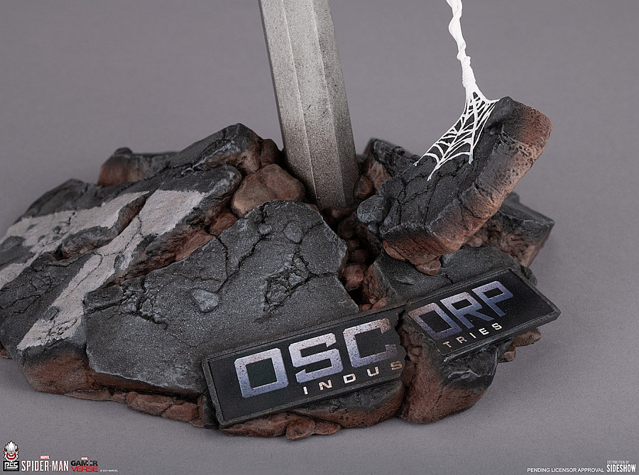 Inspired by the hit video game Marvel’s Spider-Man, the Spider-Man: Advanced Suit 1:6 Scale Diorama measures 14” tall and 13” wide as the friendly neighborhood hero leaps into battle on a street sign base. Partly buried in rubble, the city fixture features the intersection of Broadway and W 44 St on its green signage while a partially destroyed Oscorp Industries logo can be seen in the debris below. Peter Parker slings a web line to snag a chunk of concrete, making the perfect projectile weapon in a pinch.