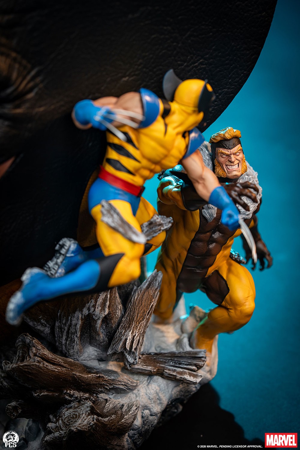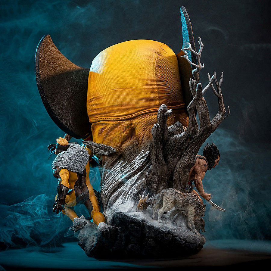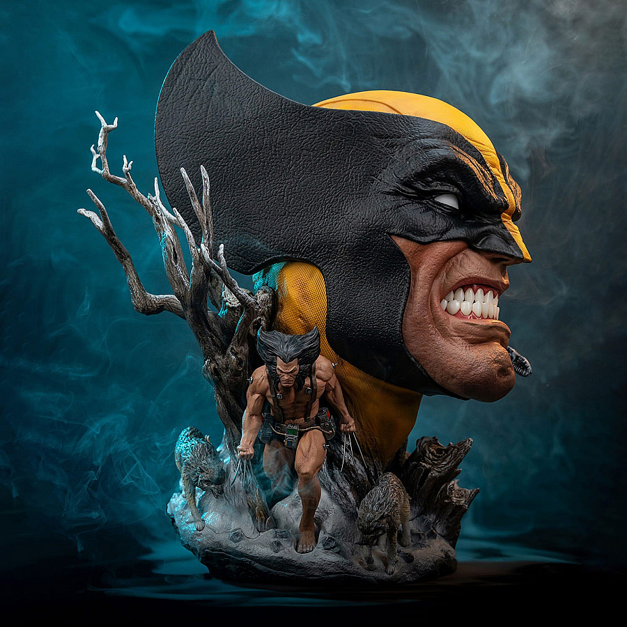 The Weapon X scene features the feral test subject trudging through the snow with his claws bared and a pair of wolves at his sides. On the other side of the bust Wolverine is shown in his famous blue and yellow costume, leaping into battle against his arch enemy Sabretooth.
