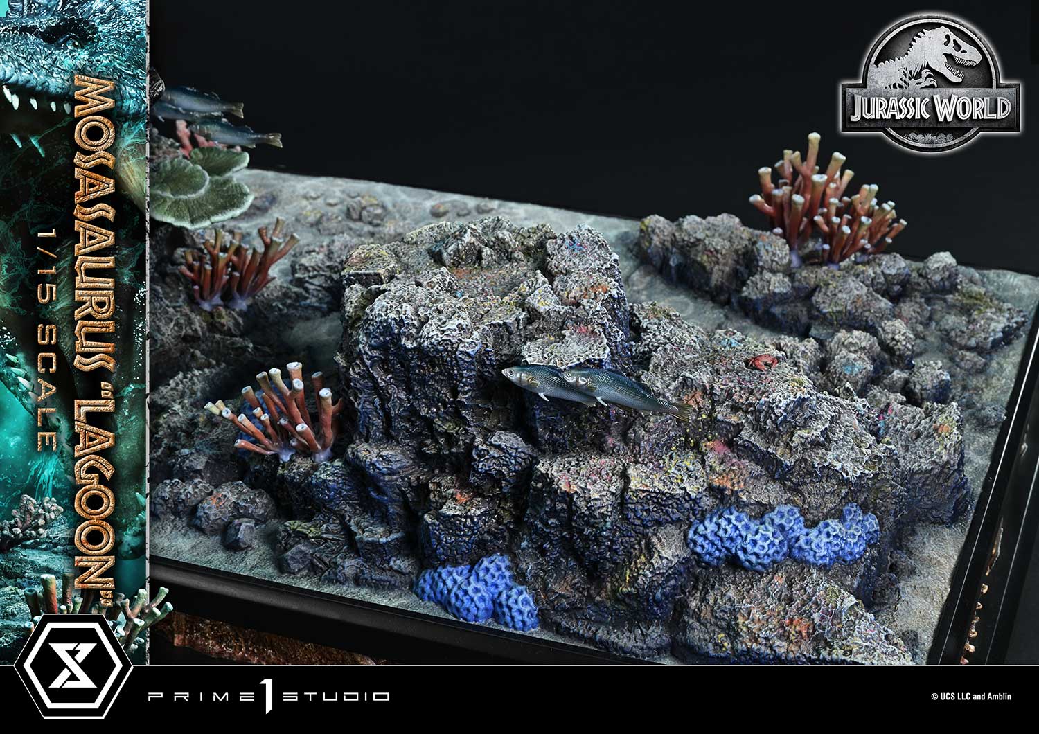 The specially designed base illustrates the ecosystem of the lagoon in striking detail: red and blue corals, schools of fish swimming alongside the predator, and a great white shark fleeing in desperation. The Jurassic World title logo on the front completes the display, drawing viewers into the film's world.