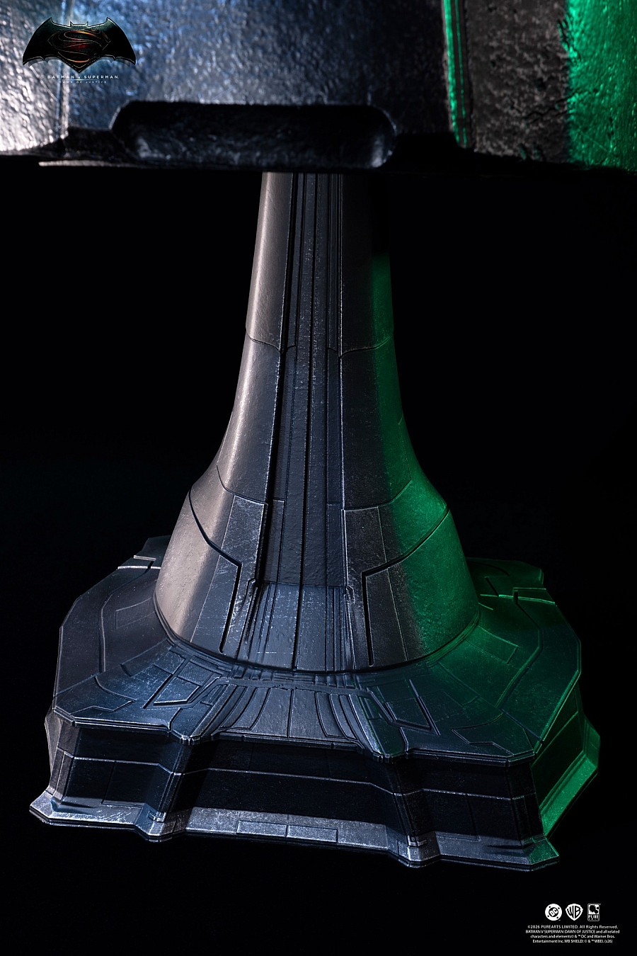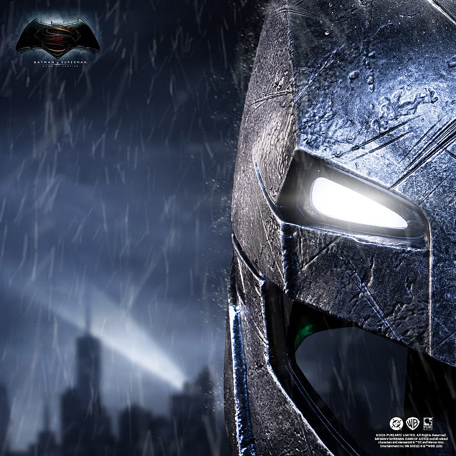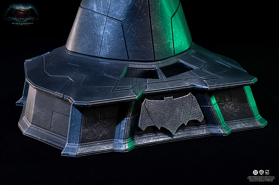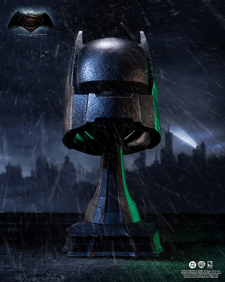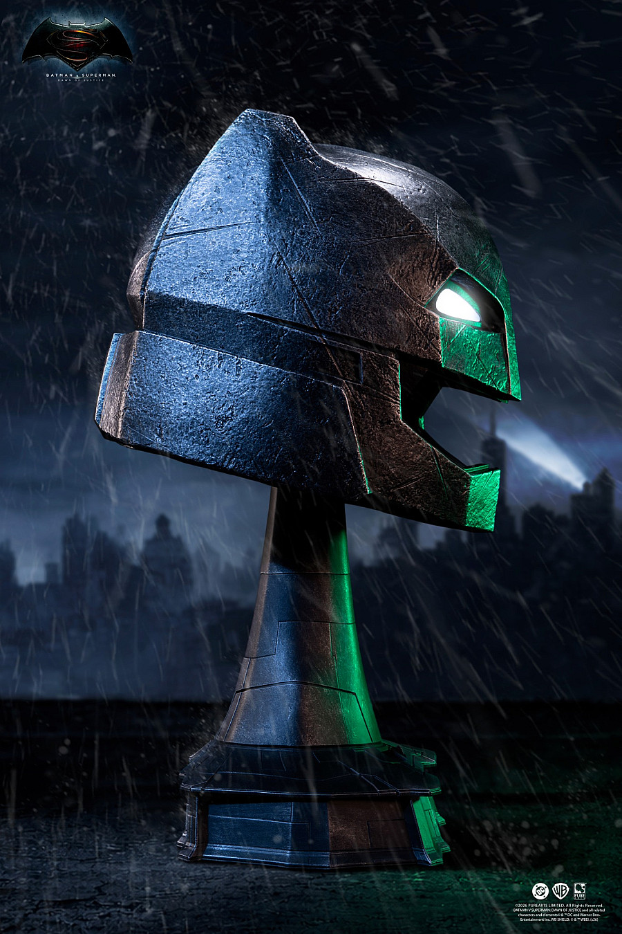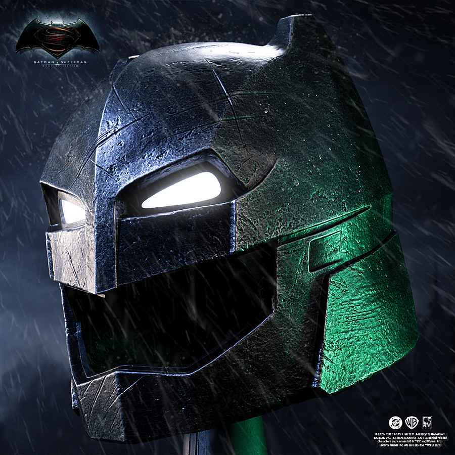 Equipped with LED light-up functionality, the eye lenses bring the armored helmet to life and enhances its intimidating battle-ready look. Presented as a high-end display piece mounted to a matching armored base featuring the Batman logo, the helmet highlights the raw strength and utilitarian design of this iconic version of Batman - an incredible display piece for fans of Batman v Superman: Dawn of Justice.