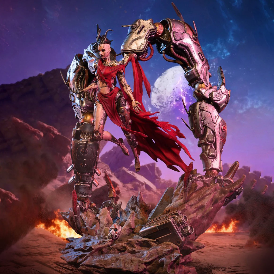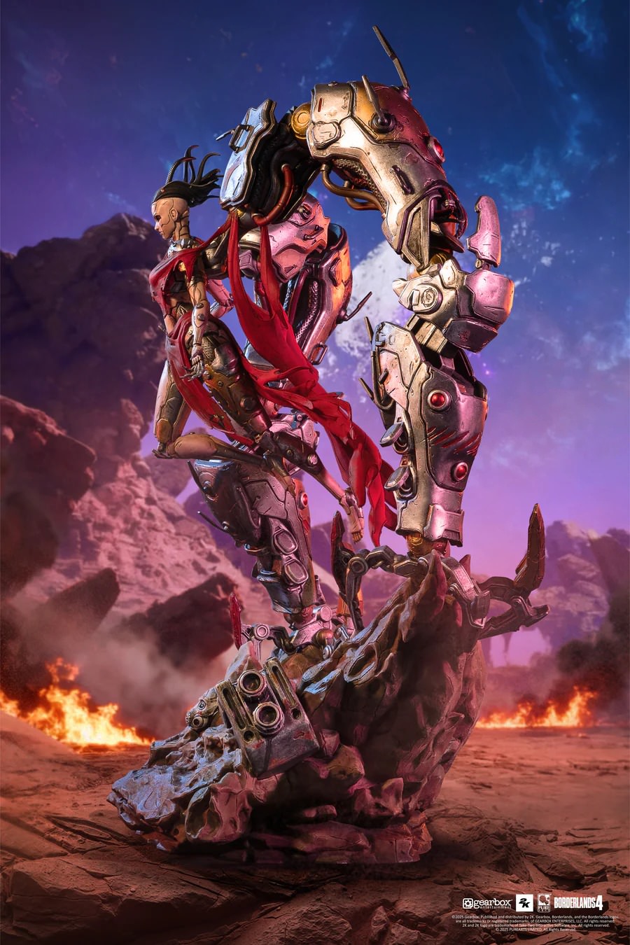 Are you ready to take on Callis, the Ripper Queen? The fearsome ruler of the Rippers from Borderlands 4 towers above a shattered battlefield base covered in the wreckage and chaos of Kairos, including the eerie remains of a Psycho Bandit’s mask. From her massive mechanical arms to her exposed cybernetic frame, every detail of flesh and steel capture her terror and power. This 1/6 Scale statue is HUGE, measuring over 26 inches in height!