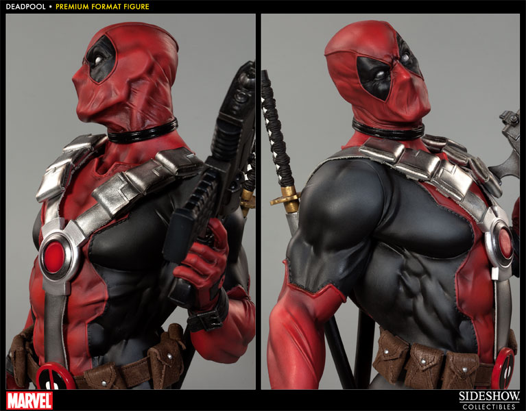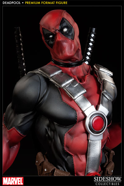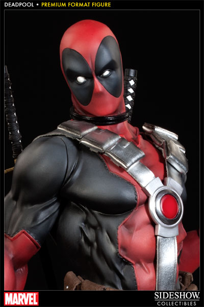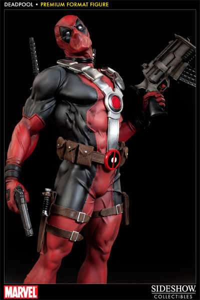 Marvel's Merc with a Mouth stands ready for action in the Deadpool Premium Format Figure from Sideshow Collectibles. Unmistakable in his trademark red and black costume, fully sculpted, the glib master assassin is girded for combat with weapons for any occasion. A scaled-down assault rifle and automatic pistol are gripped in his fists. And should the fighting get close and personal, twin katanas are ready at his back. A deadly dagger rests in a leather sheath at one hip, and who knows what surprises are contained in those leather pouches on his belt? Standing at 20 inches in overall height on a base ringed with bullets, the Deadpool Premium Format Figure will make a lasting impression on any collection.