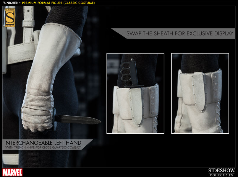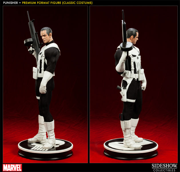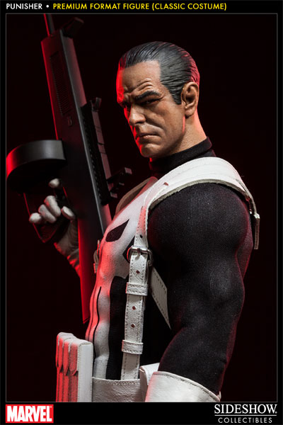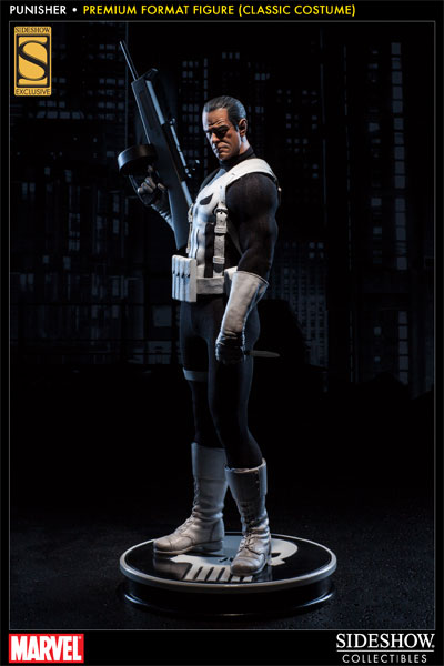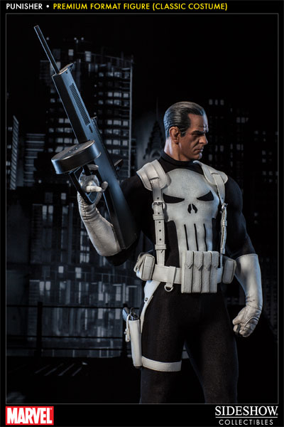 Sideshow Collectibles is proud to present the Punisher Premium Format Figure. Frank Castle comes ready to wage his relentless one-man war on crime, in his traditional classic costume. Marvel Comics' vigilante 'anti-hero' is armed for vengeance with a fully automatic shotgun and holstered pistol. He wears a set of brass knuckles for close quarters combat, and in a bind, there's a concealed trench blade strapped to his boot. The Punisher Premium Format figure is an outstanding addition to any Marvel collection.