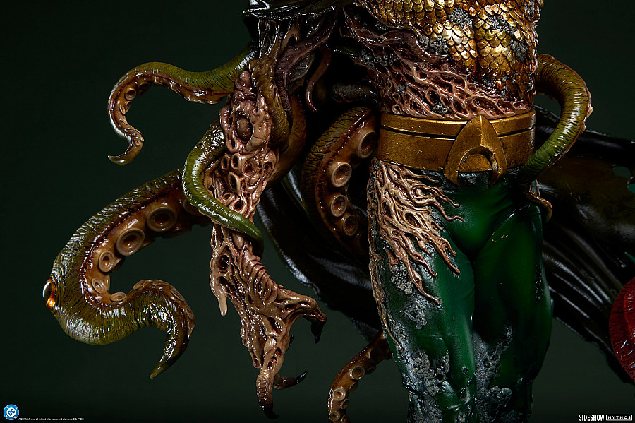Inspired by the character’s comic book appearance, the fully sculpted DC statue presents an eerie guardian covered in crustaceans, fish scales, and other cold-blooded components. Distressed metallic paint on his rusted armor echoes a shipwreck long forgotten in the cold, unforgiving ravines of the ocean floor. Aquaman wields a weathered gold trident while he marches forward, braced for battle and bearing all the scars of his past. A red squid joins him from fathoms deep, and as the hero’s own green tentacles join it, man becomes myth ... becomes monster.