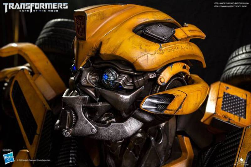 The design of the Bumblebee Ultimate Scale bust is inspired by the "Transformers 3" movie poster. To capture the character, Queen Studios’ artists have meticulously crafted “Bee’s” outer Chevrolet Camaro armour, hand painting every detail, from the fine lines, to the scuffs and scrapes on the bodywork. Underneath the armour, the inner mechanical workings are carefully sculpted to create an authentic depiction of the extraterrestrial robotic life form.