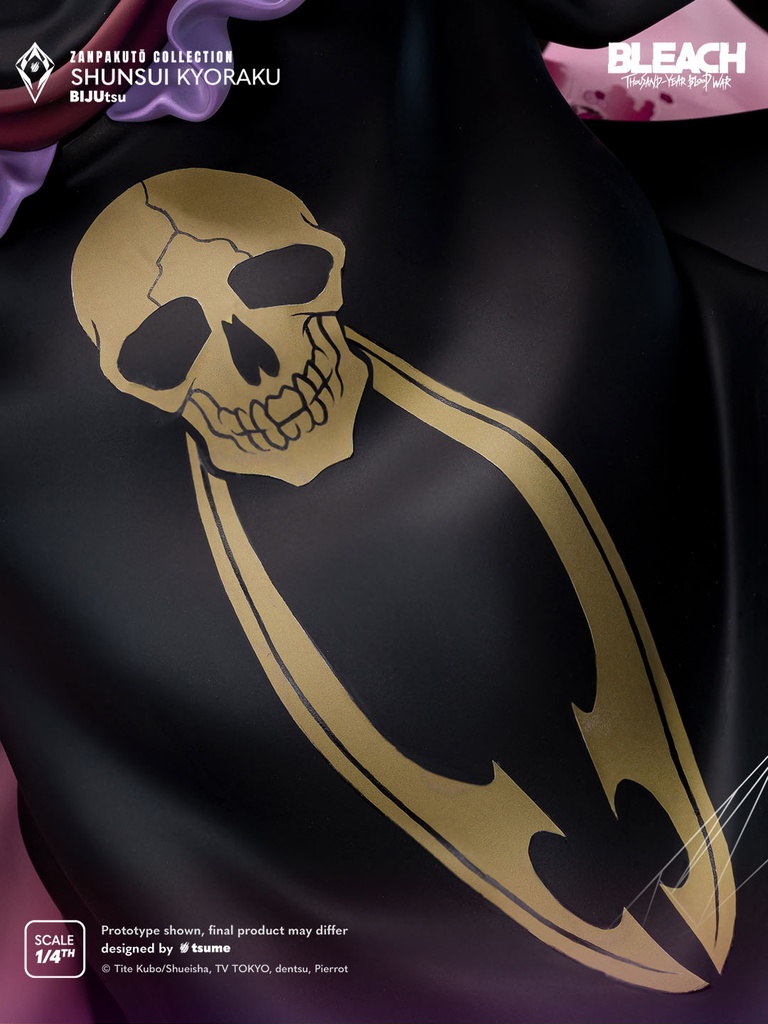 Every element of this piece is designed to mirror the four-act tragic structure of classical Japanese theater.Katen Kyōkotsu hovers over Shunsui’s left shoulder, suspended in an unsettling stillness that. Her presence highlights the devastating power of the new Captain Commander.
