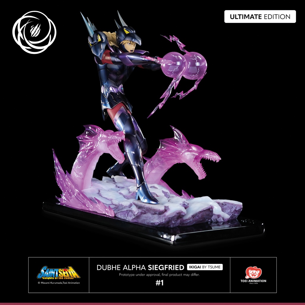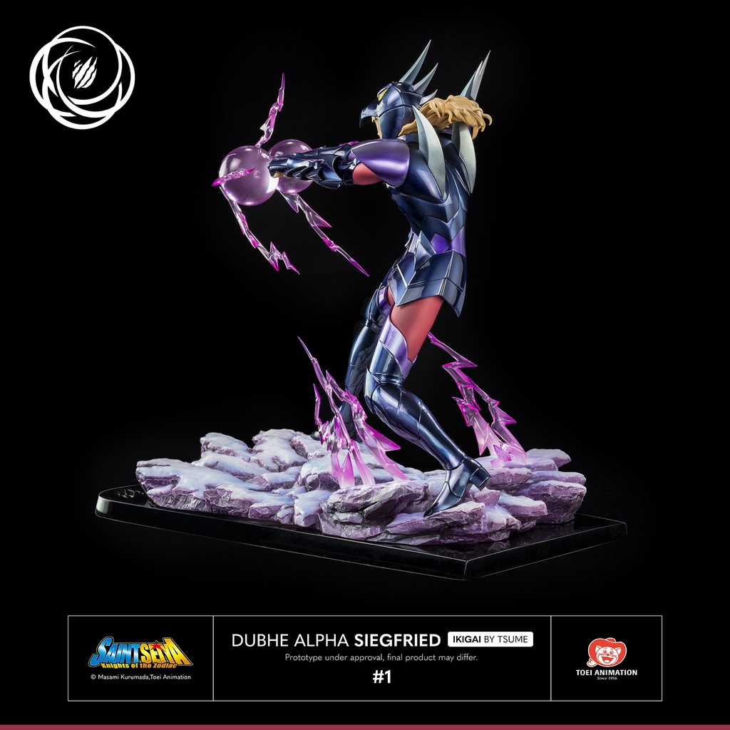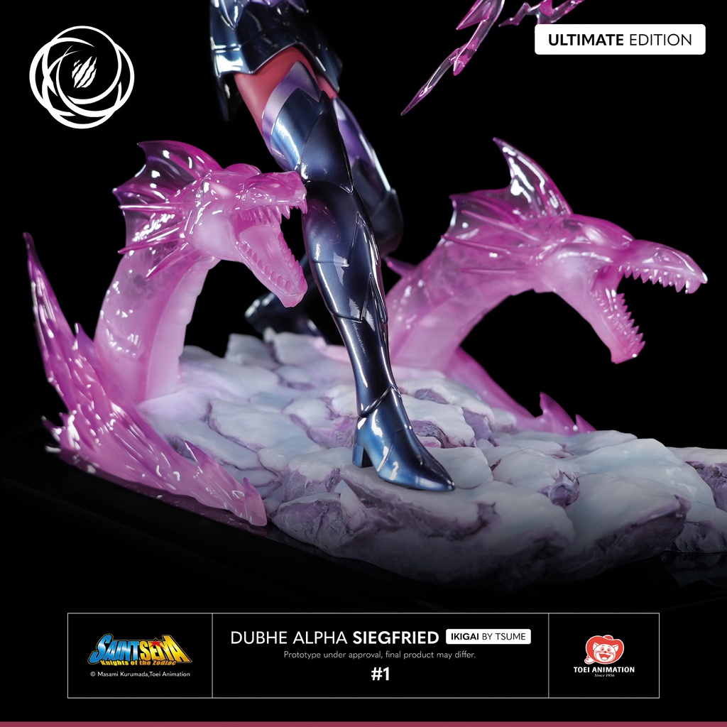 Cross the path of the mightiest God Warrior towards Odin’s altar: meet Dubhe Alpha Siegfried Ikigai! The Asgard God Warrior in the service of Odin and his prietress Polaris Hilda, forms the final bulwark during the Battle for Asgard, being this Arc antagonist. His Myth Cloth with metallic reflections has the characteristic form of Fafnir, the dragon slain by his ancestor Siegfried from whom he inherits the strength but also the only weakness, his heart. Blinded by his love for Hilda, he refuses to admit that she is bewitched by the Ring of the Nibelung and manipulated by Poseidon, while he suspects the Athena’s Saints of desiring to annihilate Asgard. Thus, he confronts Seiya, the first to arrive in that place. Ignoring the Saint’s innuendo about his sovereign whom he has sworn to protect, he delivers his final blow: the Dragon Bravest Blizzard! Intensifying his Cosmos, he creates lightning around his body and concentrates this energy in two transparent spheres. With both arms outstretched forward, he throws them in Seiya’s direction, ending any discussion.
