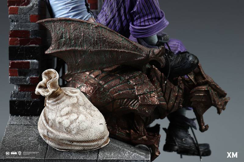 This is a piece that pairs perfectly well with XM’s Batman: White Knight (Batcycle Edition) statue, with Art Deco style architecture making up the base of the statue. The Joker is himself seen sitting atop a weathered copper gargoyle covered in green patina, wearing a pair of leather boots. He is seen sporting a new set clothes, wearing purple pin-stripe pant legs with realistic fabric-like folds and suspenders while draped in a tattered light blue t-shirt with the batman logo centered across his chest.