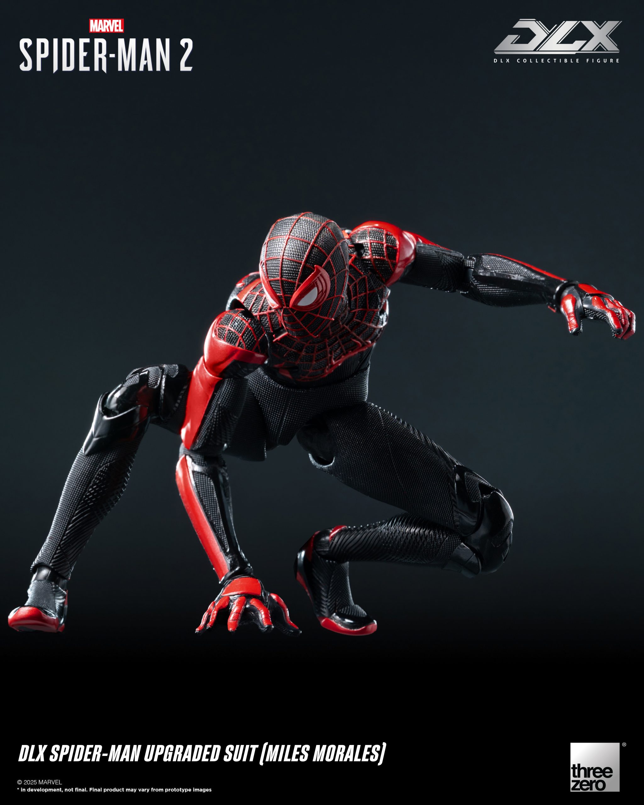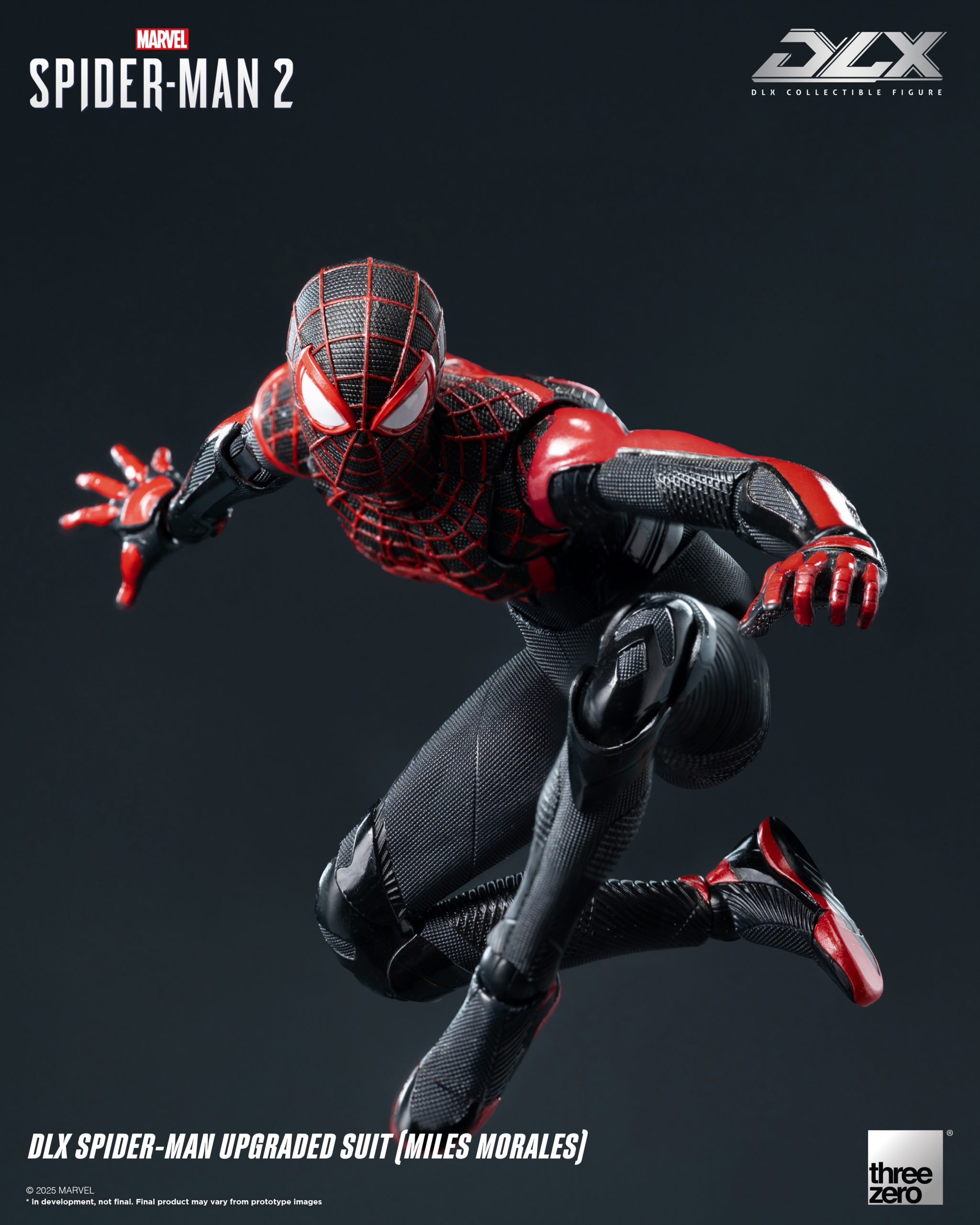 The DLX Spider-Man Upgraded Suit (Miles Morales) stands approximately 15.7 cm (~6”) tall and features threezero’s renowned DLX die-cast system, with approximately 39 points of articulation, providing excellent poseability and durability. The figure features well-defined, sculpted muscles and a form-fitting suit that showcases various fabric textures, reflecting the rich costume design details from the video game. The black suit is decorated with red lines and a sculpted mesh pattern, and the large red spider emblem on the chest and back accurately replicates how it appears in Marvel’s Spider-Man 2.